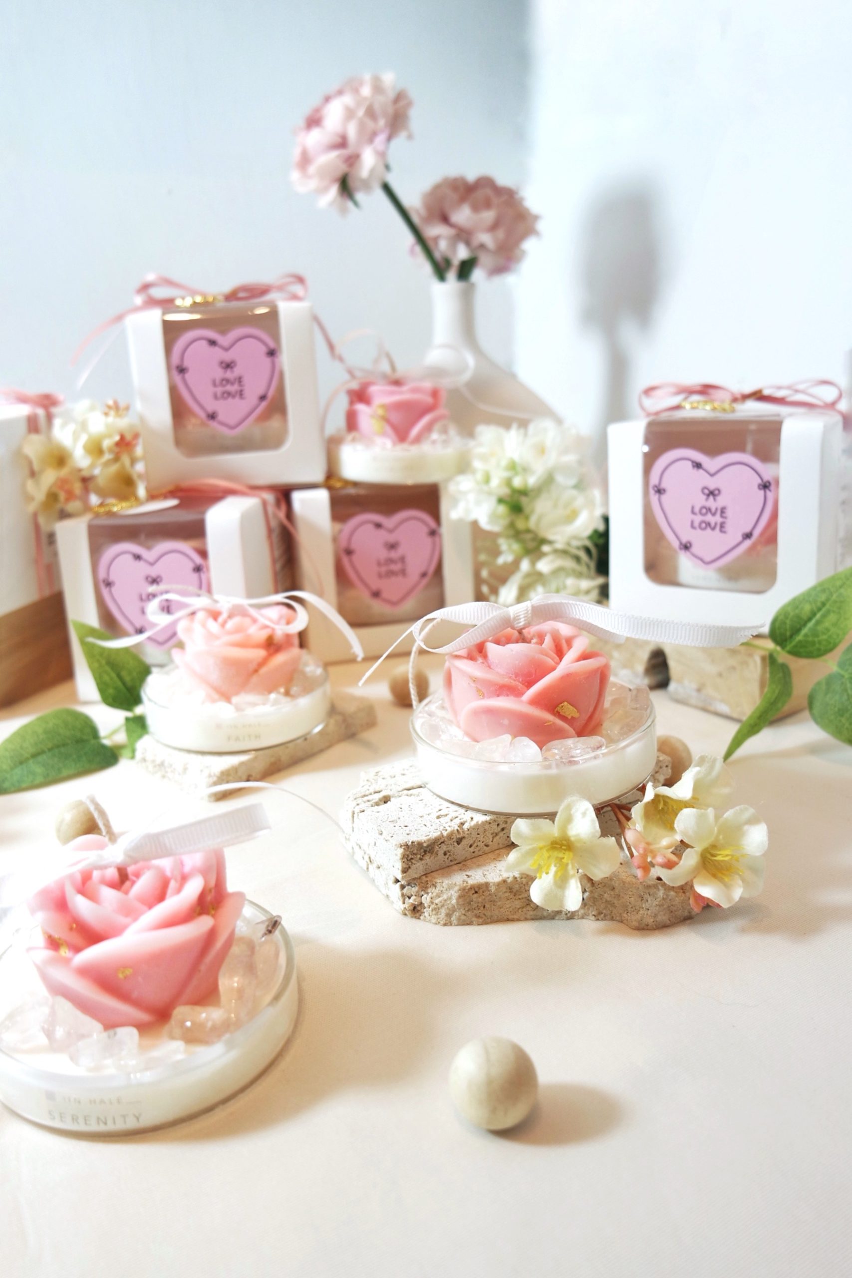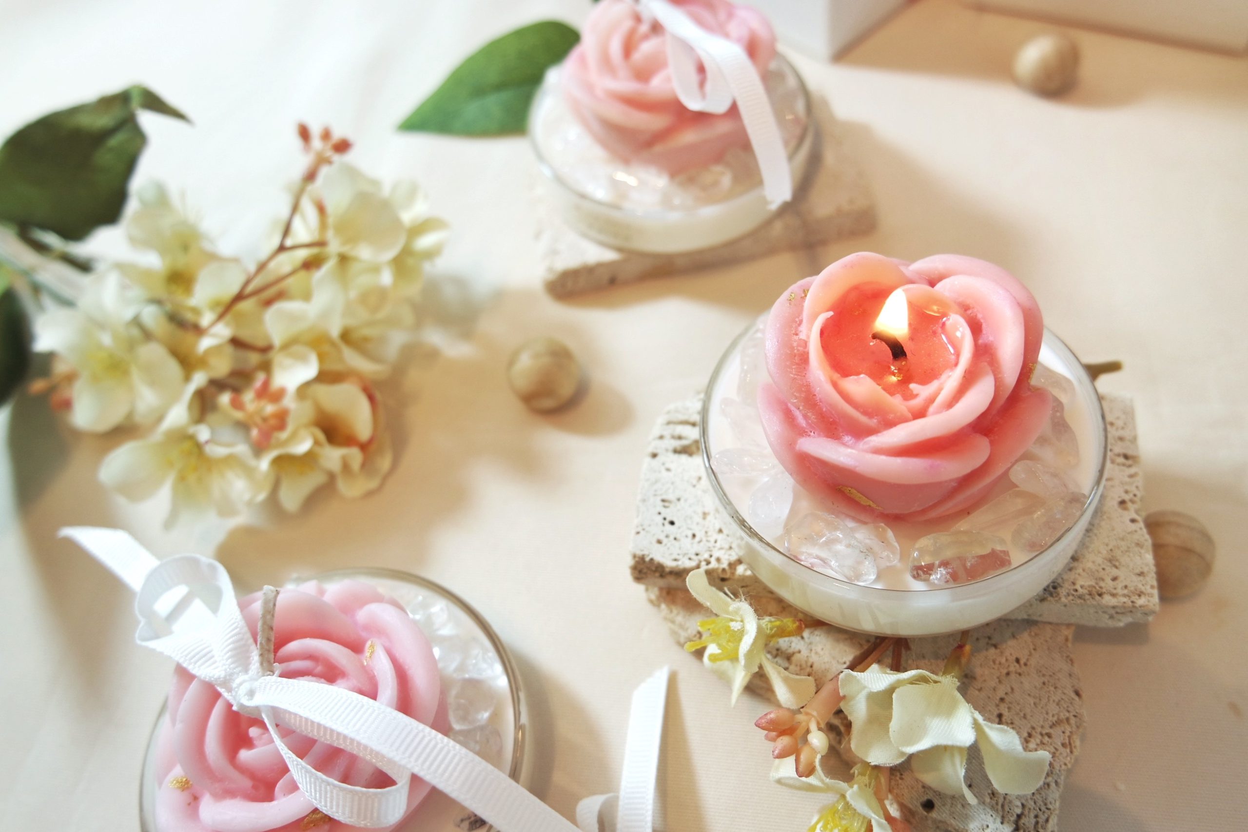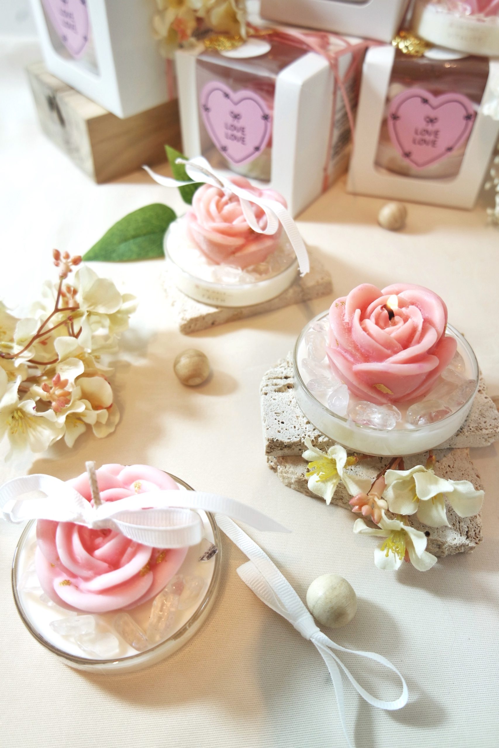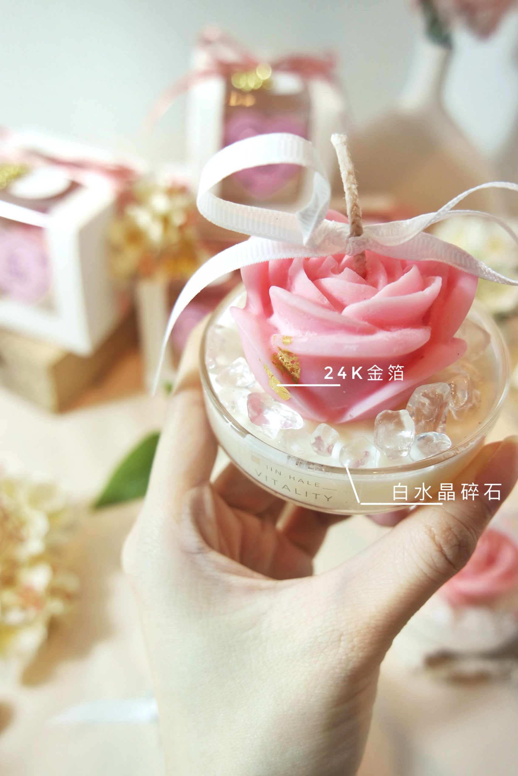 24k Gold leaves sprinkled on top of the Rose candle, alongside Clear Quartz.