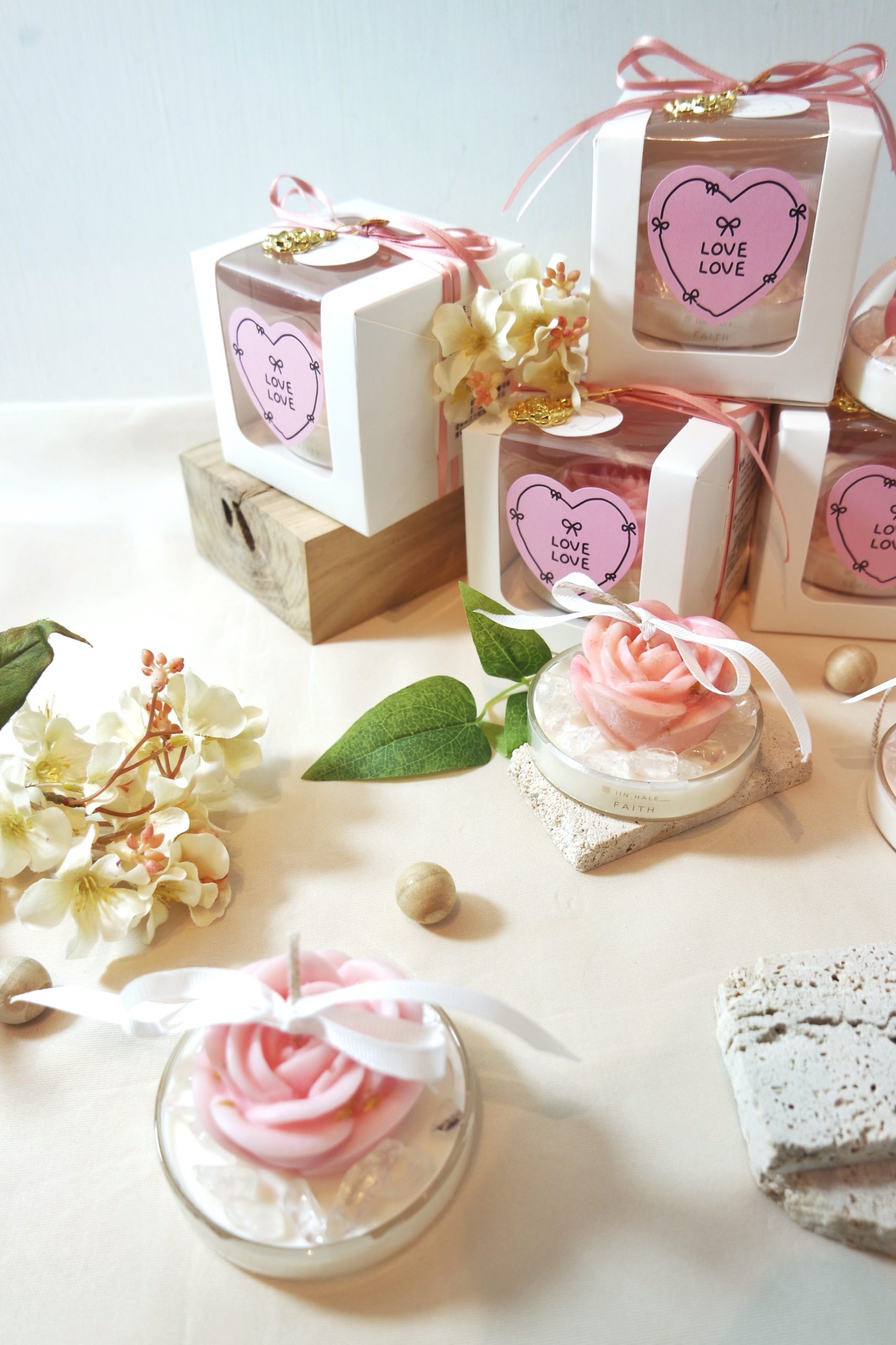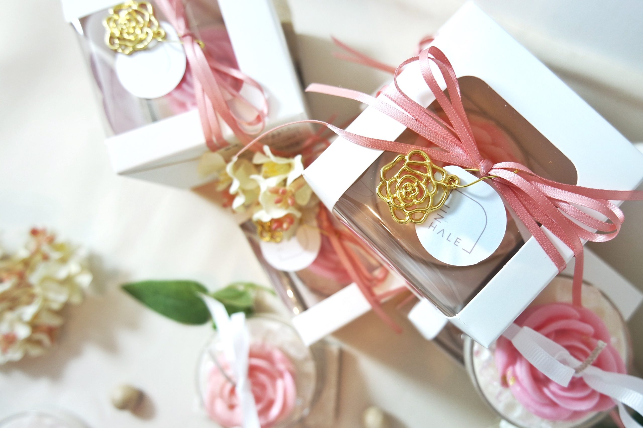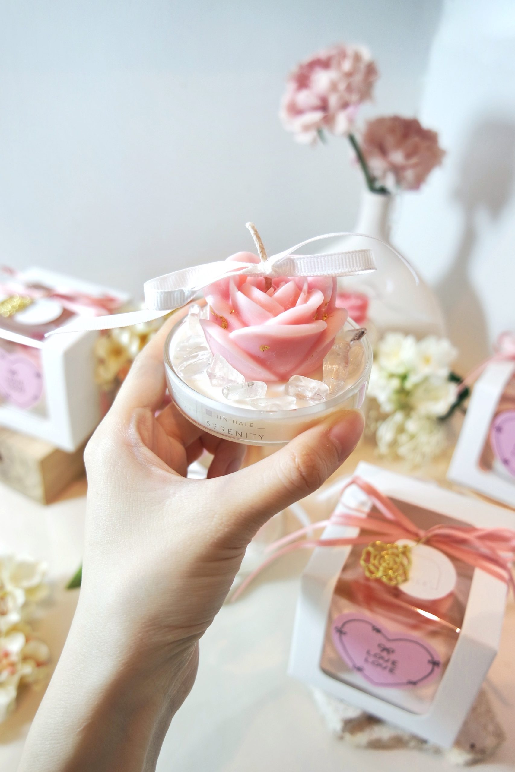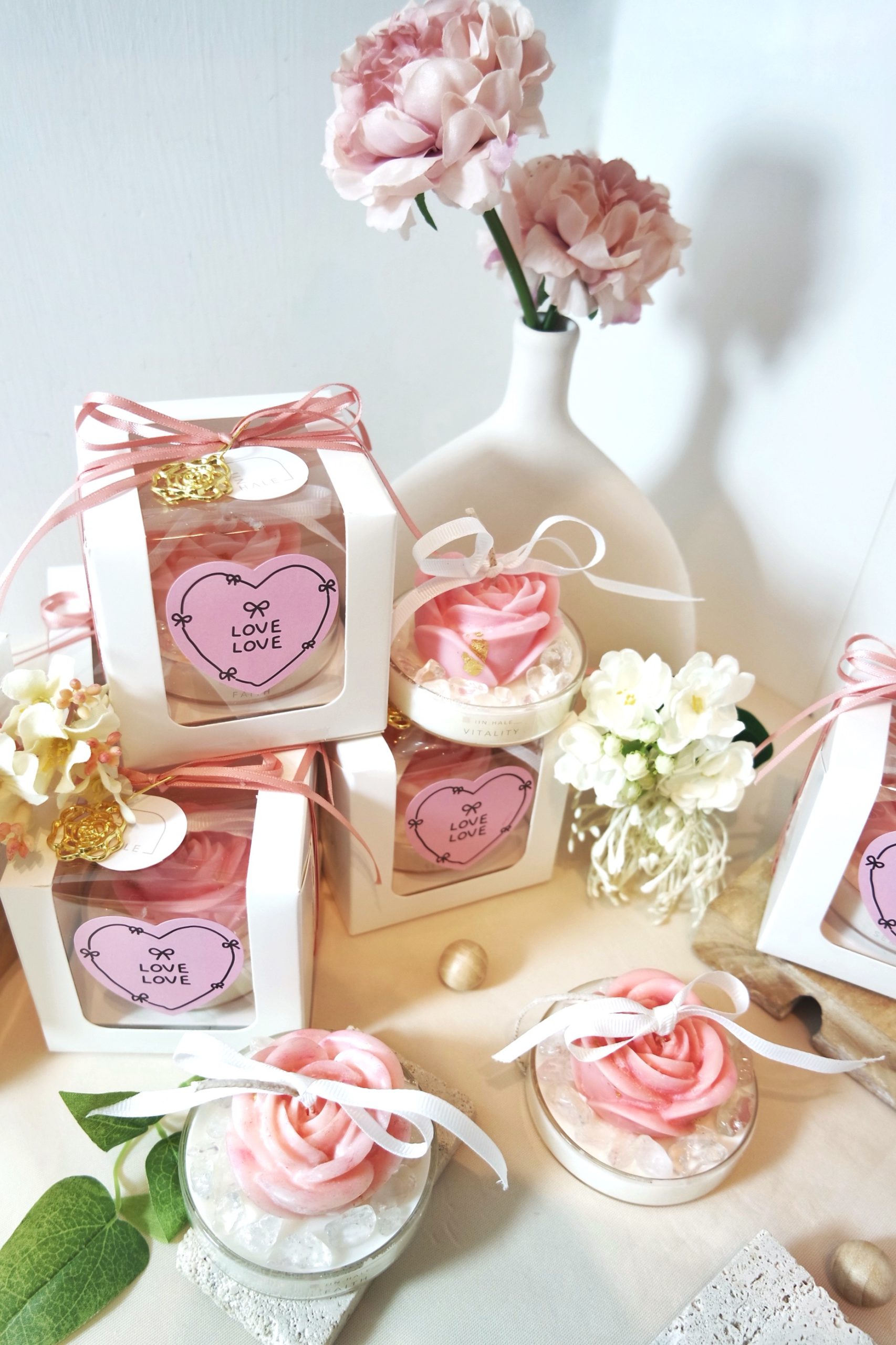 24k Gold leaves sprinkled on top of the Rose candle, alongside Clear Quartz.